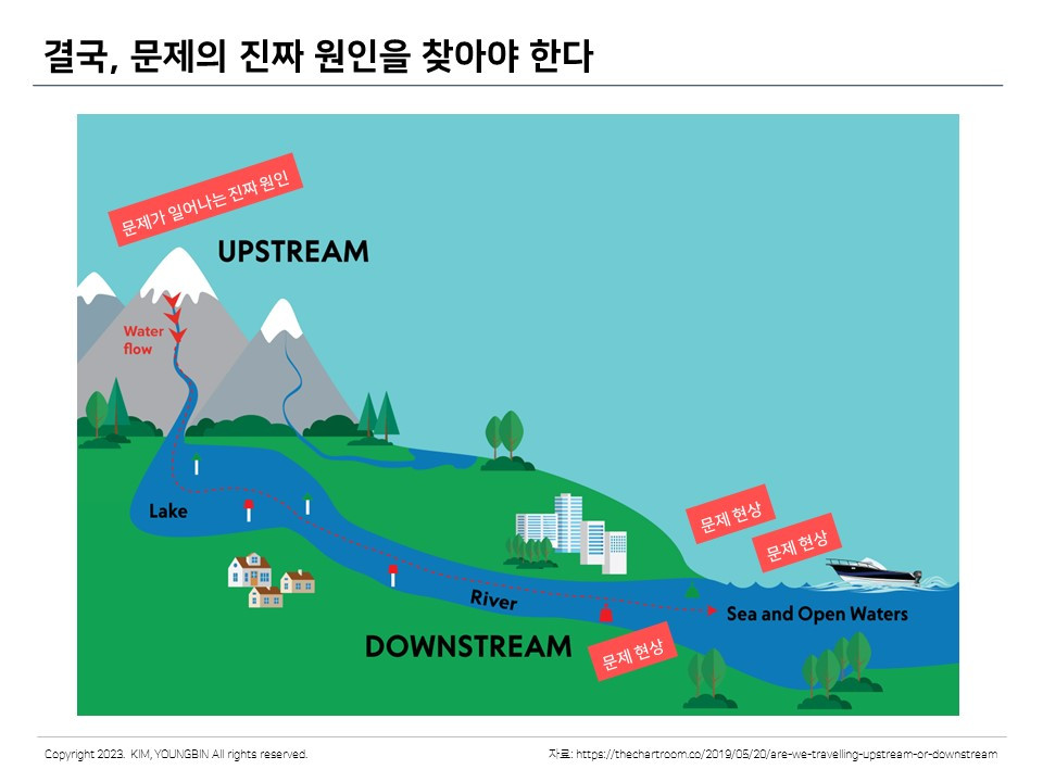 우리가 집중할 부분은 문제의 원인이다. 그것도 진짜 원인을 찾는 것에 집중해야 한다. 문제의 진짜 원인은 눈에 잘 보이지 않는다. 우리 주변의 다양한 현상을 따라 깊이 들어가야 찾을 수 있다. 마치 큰 강의 물줄기를 따라 계속 올라가 산 꼭대기에서 강물의 시작점인 작은 물줄기를 찾는 것과 같다.