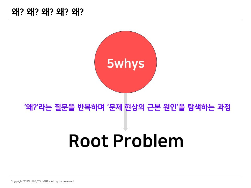 시민참여과정에서도 이런 당황스러운 솔루션들이 종종 나타난다. 참여하는 사람 모두가 당사자가 아니고, 참여자들은 문제를 제대로 정의하는 경험을 해본 적이 없는 경우도 꽤 많다. 이런 상황에서 문제를 정확하게 정의하는 단계와 시간은 매우 중요하다. 그렇다면 어떻게 해야 할까? 다양한 문제정의 방법 중에 하나를 소개한다. 바로 5whys 방법론이다. 쉽게 말해 ‘왜’를 다섯 번 질문하는 것이다. 어떤 현상에 대해 다섯 번의 ‘왜’를 질문하면 그것의 진짜 원인(root problem)을 찾을 수 있다. 매우 심플하다.