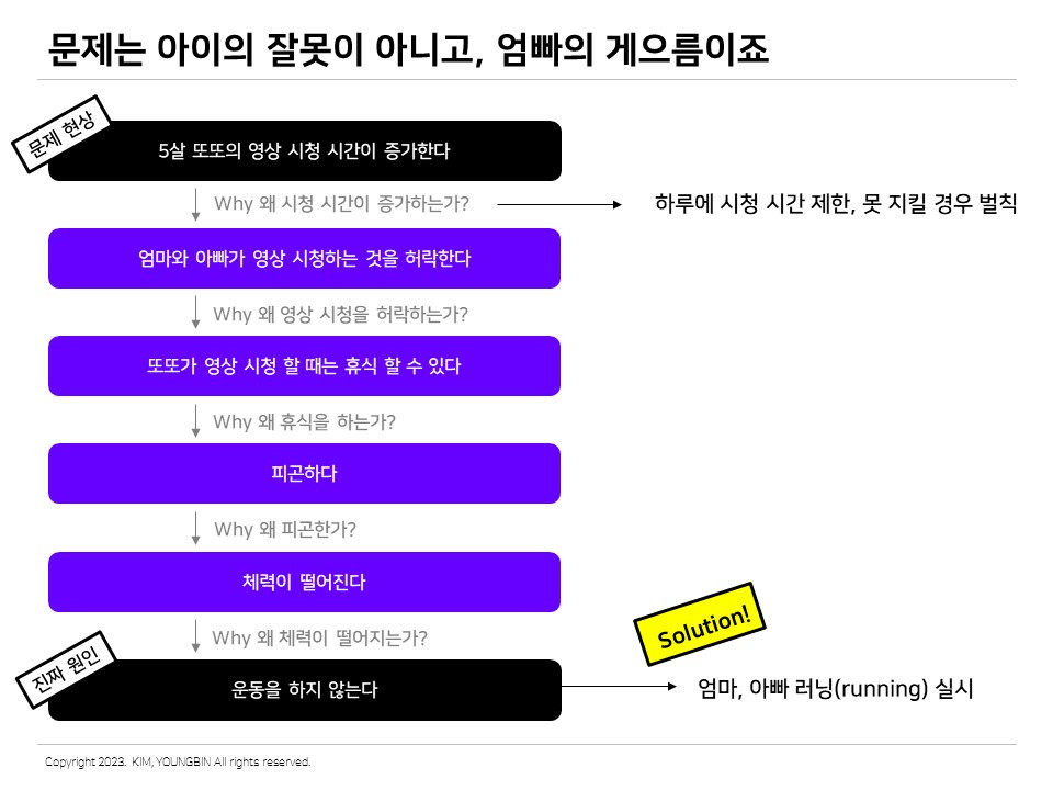 예시를 하나 더 살펴보자. 이번 사례는 필자의 경험이자 육아를 하고 있는 많은 부모의 경험일 것이다. 우리 가족은 5살의 아이, 닉네임 또또와 함께 살고 있다. 또또는 만화 등 다양한 영상 시청을 좋아하기 때문에 시청 시간을 어떻게 조절해야 하나 고민이다. 이 경우 어떤 솔루션을 생각할 수 있을까? 직접 다섯 번의 질문을 시작해 보았다.