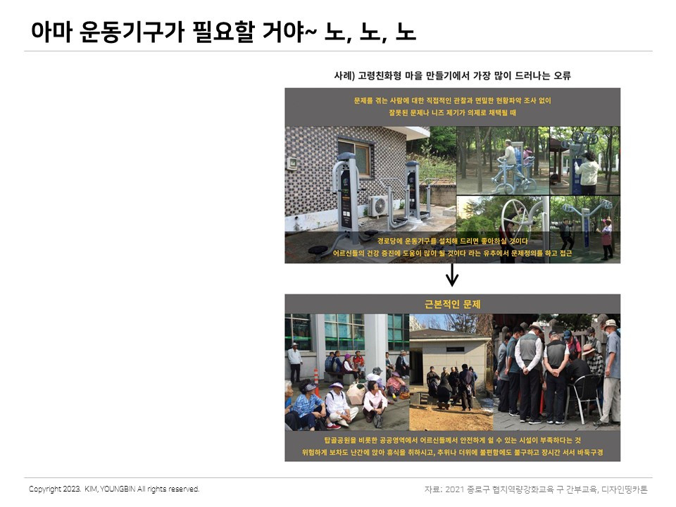 오늘 이야기하고 싶은 것은 바로 이것이다. 우리가 일상적으로 무수하게 판단하여 결정하는 솔루션들이 잘 살펴보면 이처럼 어이없는 것일 수 있다. 문제의 원인, 진짜 원인을 정확하게 진단하지 않으면 생각보다 어이없는 솔루션을 낼 수 있고, 우리 주변에는 이런 경우가 꽤 많다. 더욱이 정책 영역으로 들어오면 이런 장면들이 심심치 않게 나타난다. 이유가 다양하겠지만 확실한 것 하나는 문제의 진짜 원인을 제대로 찾지 않아서이다. 정책을 기획하고 수립하는 그룹에서 ‘아마, 이럴 것이야~ 이런 게 도움이 될 것이야~’라고 생각하고 정책을 진행하는 것이 문제이다. 확인하지 않고, 물어보지 않고, 생각만 하면 이런 경우가 종종 나타난다.
