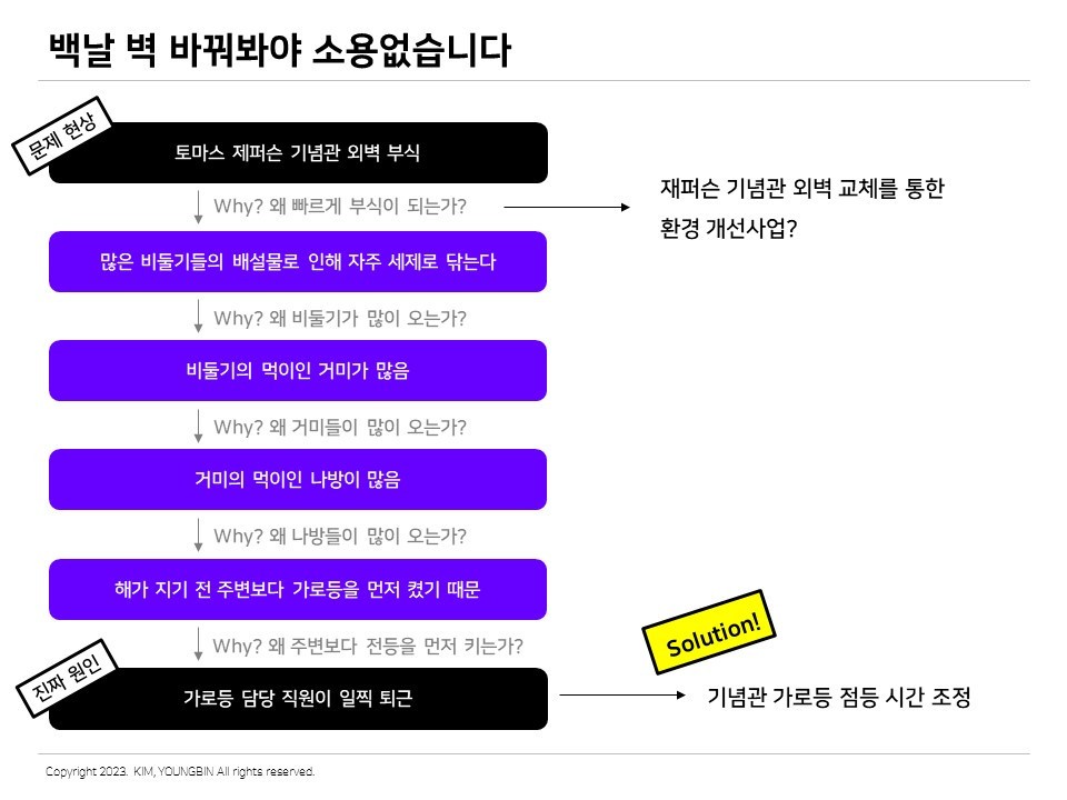 다섯 번의 질문으로 새로운 원인을 발견했다. 외벽이 부식되는 진짜 원인은 '가로등 담당 직원이 일찍 퇴근'하기 때문이다. 첫 번째 '왜' 단계에서는 사뭇 상상하기 어려운 원인을 끌어냈다. 결국 기념관 외벽 부식을 막기 위해서는 가로등 점등 시간을 조정해야 한다.