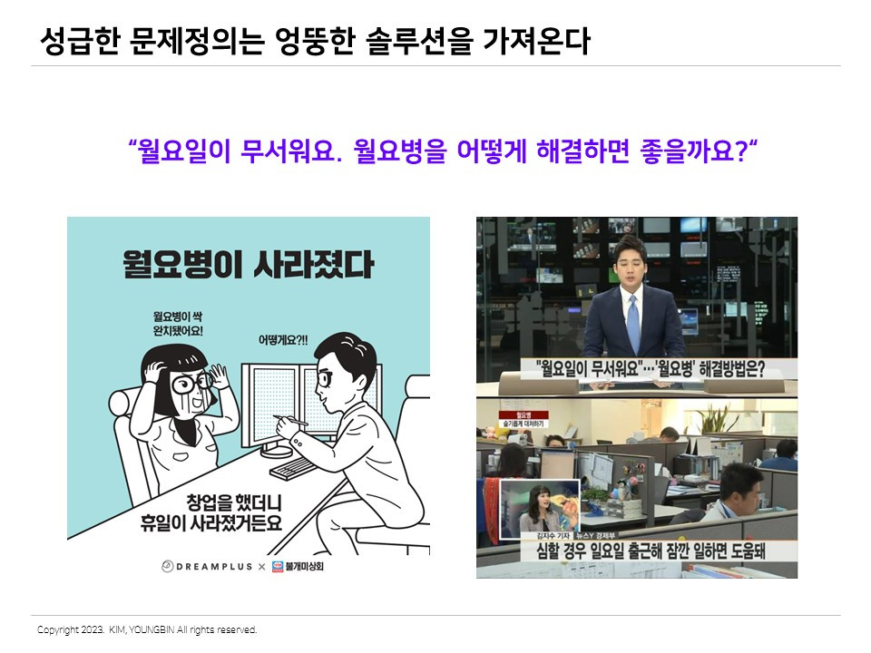 아, 다시 봐도 웃프다. 월요병을 해결해 달랬더니 일요일에 출근하라니. 정말 기가 막힌 솔루션이다. 근데 어찌 보면 말이 아주 안 되는 건 아니다. 확실하게 월요병은 없어질 수 있다. 피상적으로는 아주 틀린 말은 아니다. 하지만 우리 모두 이것이 어이없다는 것을 알고 있다.