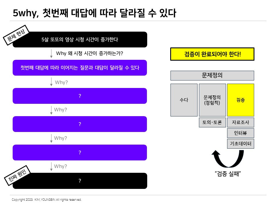 5why는 질문과 대답으로 이루어진 과정이다. 첫 번째 대답에 따라 뒷부분의 내용이 달라질 수 있다. 어떤 현상의 원인 파악을 위한 5whys는 여러가지 버전이 나올 수 있다는 의미이다. 우리는 해답의 확률을 높이기 위해 복수의 5why를 실시하고, 각각에 대해 검증하는 절차를 거치면 된다.