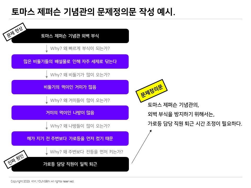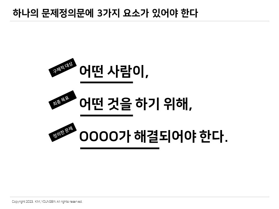 이 3가지 요소가 포함된 문제정의문을 작성함으로써 일련의 과정이 마무리되고, 머릿속에 명료하게 각인하는 효과를 볼 수 있다. 문제를 정의하는 모든 단계들은 어쩌면 마지막 한 문장을 뽑아내기 위한 과정이라고 볼 수 있다. 언제나 그렇지만 최종적 산물은 간결하고 심플할수록 파워를 갖는다.
