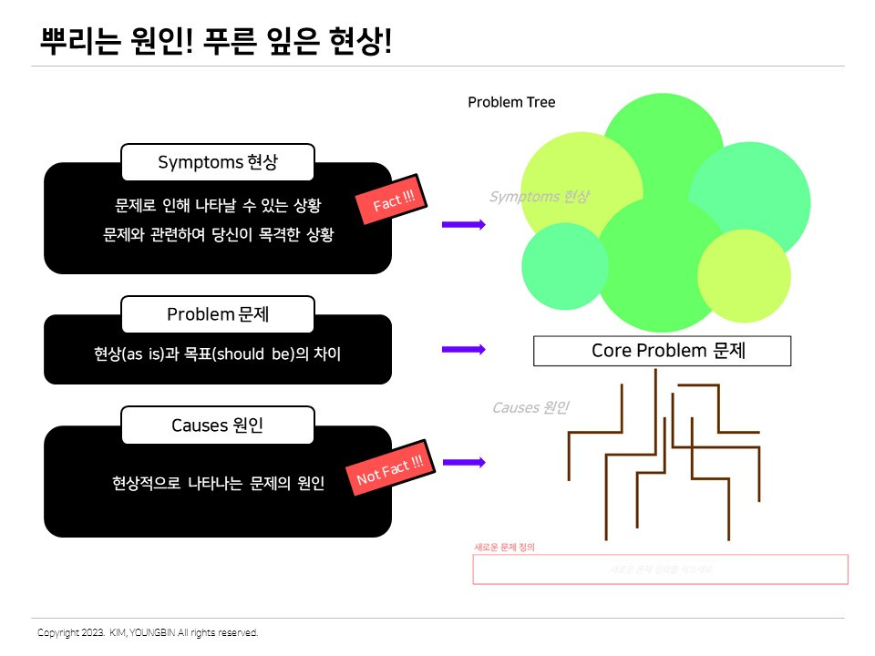 구조는 간단하다. 문제를 가운데 두고, 그 문제로 인해 나타는 현상과 원인을 각각 나무의 푸른 잎과 뿌리로 표현하는 것이다. 현상은 푸른 잎, 원인은 뿌리이다. 여기서 기억해야 할 부분은 현상은 사실에 기반하여 작성해야 하고, 원인은 추측도 포함한다. 현상은 팩트, 원인은 팩트와 추측이다. 대부분 현상은 우리가 주변에서 직접 확인하는 것들이지만 그것의 원인은 정확하지 않기 때문에 ‘~~~ 거야’라는 추측도 포함하는 것이다. 이때 현상과 원인은 생각나는대로 자유롭게 표현하고 작성하면 된다.