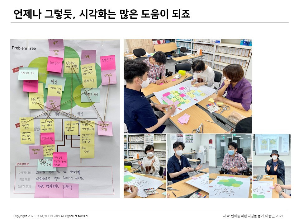 문제나무는 이런 일련의 상황을 예방할 수 있다. 막연함을 구체적으로 명확하게 보여주고, 여러 사람들이 함께 하기에 생각과 경험의 스펙트럼을 넓힐 수 있다. 논리적 인과성을 파악할 수 있고, 이것을 한눈에 시각화하여 보여준다.