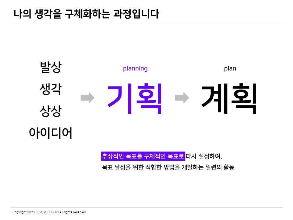 또한 기획은 진행형(ing)이다. 계획이 최종 완성된 형태라고 본다면, 기획은 아이디어에서 완성된 계획을 만드는 그 중간의 과정 모두를 의미한다. 아이디어라는 추상적인 생각을 구체적인 목표로 만들어서 그 목표를 달성하기 위한 구체적인 방법을 개발하는 일련의 활동을 ‘기획’이라고 한다. 앞으로 계속 나오겠지만 이 과정에서 중요한 것은 ‘구체화’이다. 하늘에 둥둥 떠다니는 상상을 우리가 살고 있는 땅으로 끌어내리는 작업이라고 볼 수 있다.