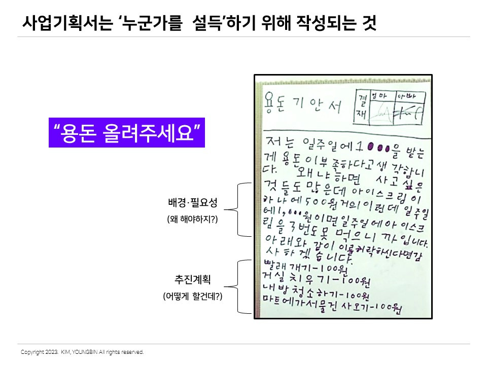 재밌는 그림을 가지고 왔다. 이 그림은 초등학생이 용돈을 올리기 위해 ‘용돈기안서’를 작성한 것이다. 아마도 용돈에 대한 의사결정자는 엄마와 아빠일 것이다. 아주 짧은 초등학생의 문서이지만 사업기획 측면에서 꽤 설득력이 있다. 자세히 보면 용돈 상향에 대한 배경과 필요성, 구체적 추진계획이 포함되어 있는 것을 발견할 수 있다.