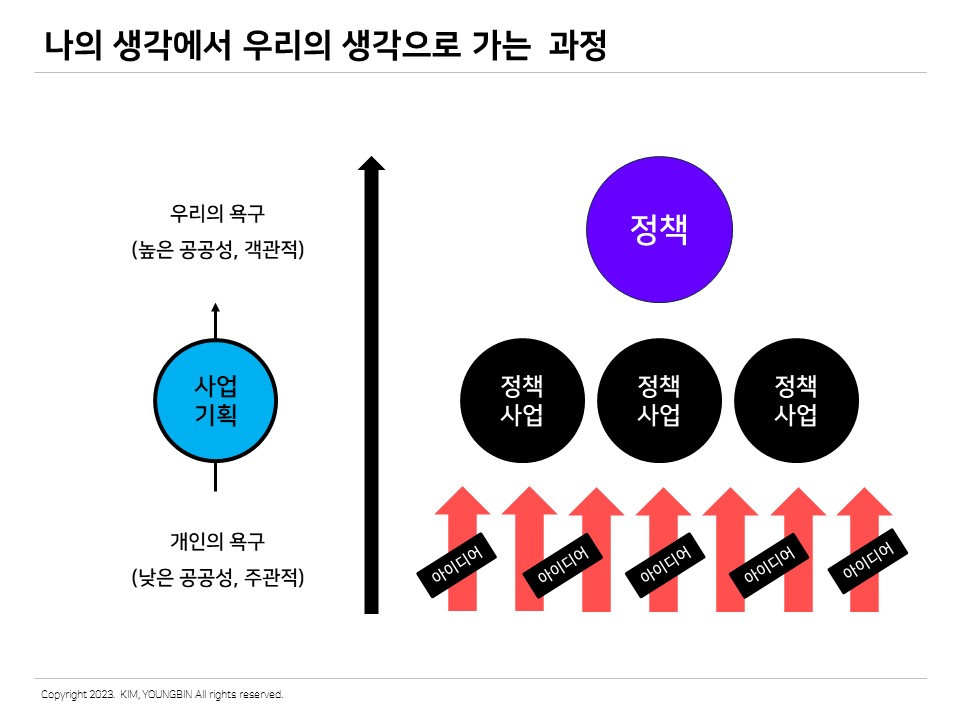 우리가 뉴스나 언론에서 만나는 그럴듯한 정책들도 아주 작은 아이디어에서 시작하는 경우가 많다. 위계적으로 살펴보면 하나의 큰 정책은 여러 가지 정책사업들로 구성되어 있고, 여러 가지 정책사업들은 다양한 아이디어에서 출발하는 구조이다. 우리가 이미 알고 있는 목적과 목표의 개념 차이와 비슷하다. 정책(목적)은 방향이고, 정책사업(목표)은 큰 방향을 이루어내기 위한 구체적 실행계획이다. 또한 아이디어에서 정책으로 만들어지는 과정은 나의 욕구에서 우리의 욕구로 가는 과정과 동일하다. 공공사업을 기획하는 과정은 내가 필요한 것에서 우리가 필요한 것을 만들어 내는 과정이라고 볼 수 있다.