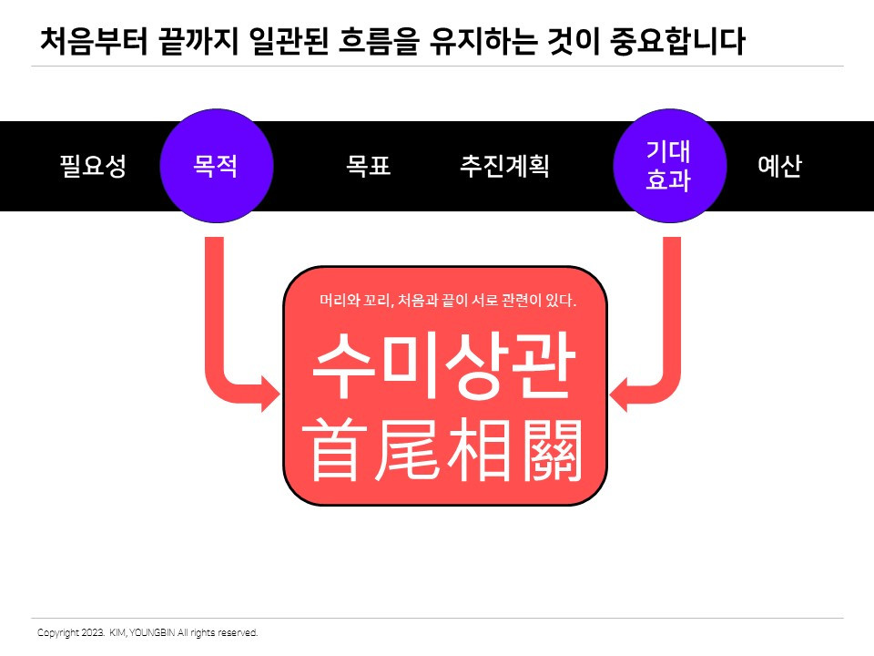 부가적으로 언급하고 싶은 것이 하나있다. 바로 수미상관 구조이다. 가끔 보면 사업계획서의 시작과 끝이 다른 경우가 있다. 이 사업으로 이루고자 하는 목적(목표)과 기대효과가 일괸되지 않고 서로 다른 내용이 서술되는 경우가 있다. 이런 경우 내용이 좋더라도 전체적으로 일관성과 신뢰성이 떨어진다. 어찌 보면 기본에 대한 문제이기 때문이다. 사업계획서는 목표와 기대효과가 하나의 맥락으로 이어지는 수미상관 구조가 필요하다는 것을 기억하자.