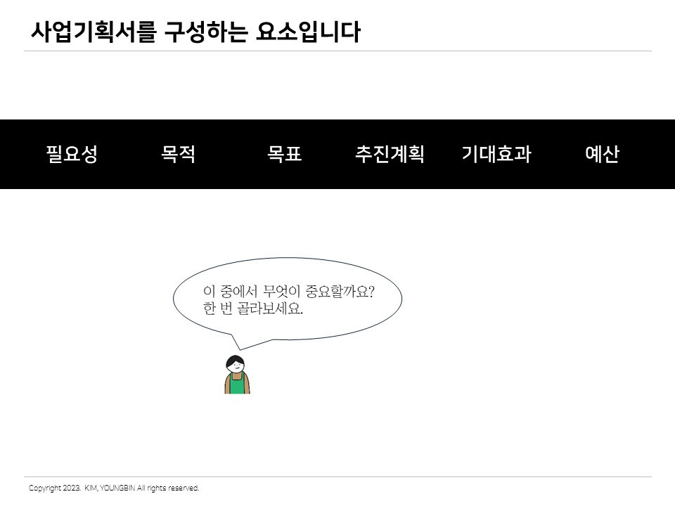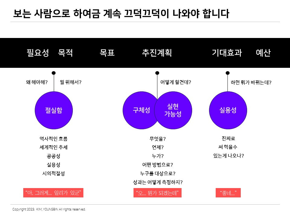 중요한 건 사업계획서를 보는 동안 계속 고개가 끄덕끄덕해야 한다는 것이다. 시작부터 끝까지 물 흐르듯 동의할 수 있는 맥락을 유지하는 것이 중요하다.