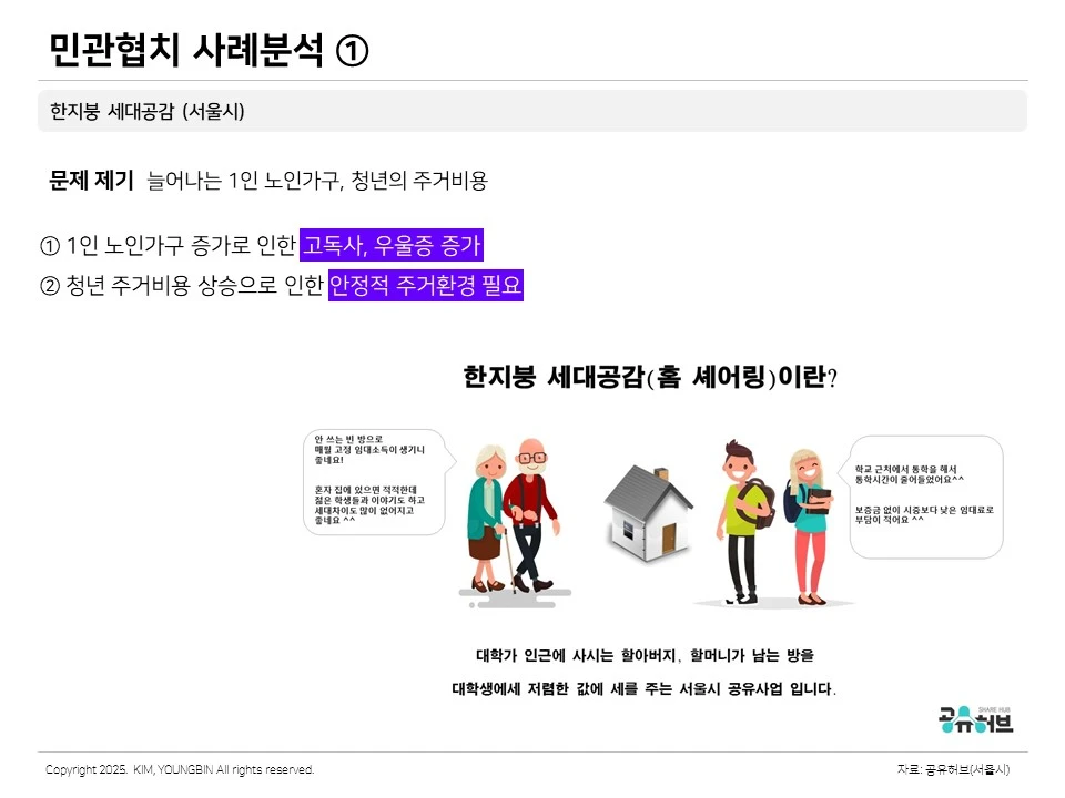 이 두 가지 문제를 동시에 해결하는 정책이 바로 한 지붕 세대공감이었습니다. 홈쉐어링이죠. 최근 해외 대도시를 중심으로 세대 간 홈쉐어링 정책이 다시 등장하고 있는 것을 보면 여전히 우리가 해결해야 하는 문제인 것 같습니다.