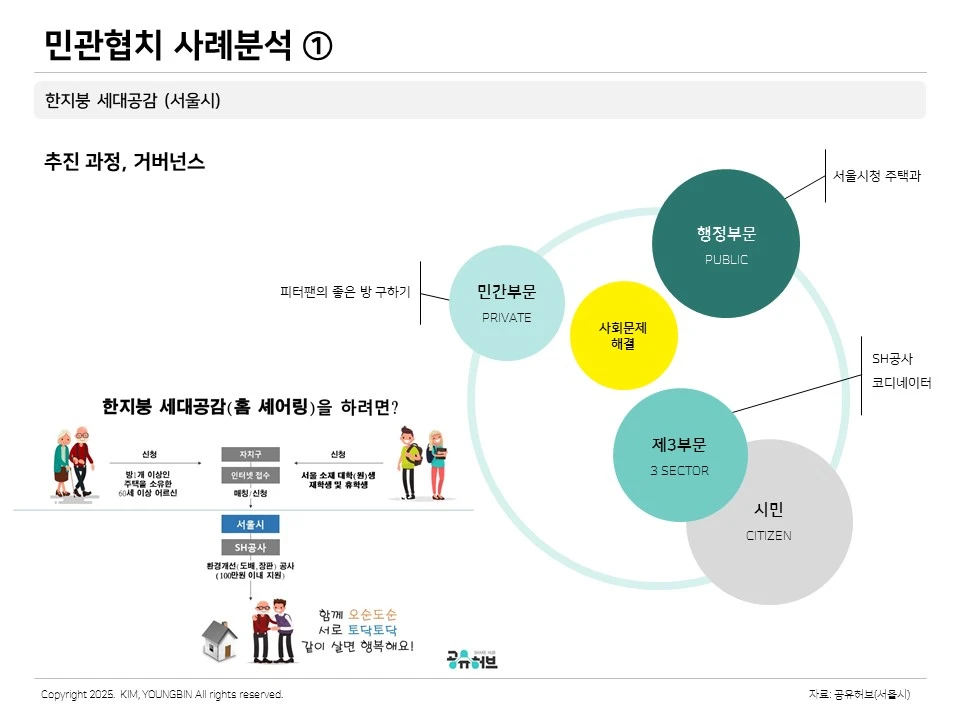한 지붕 세대 공감의 거버넌스 구조는 비교적 간단합니다. 행정 부문은 서울시청 주택과가 담당하고 있었고, 민간 부문은 피터팬의 좋은 방 구하기라는 운용사가 운용을 담당하고 있었습니다. 제3부문으로는 공사가 들어왔습니다. 공공기관이 들어와서 제3부문에 해당하는 역할을 했었습니다. 거버넌스 구조는 이 정도로 구성되어 있었습니다.
