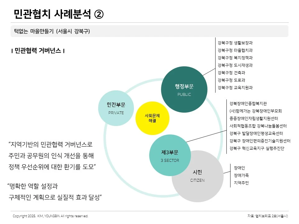 제3부문의 참여주체도 꽤 많습니다. 강북장애인복지관, 장애인생활지원센터, 사회적 협동조합, 혁신교육지구 실행추진단 등 7개 기관이 참여하고 있습니다.