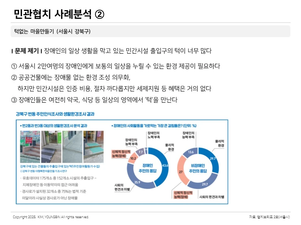 이 당시 서울시에는 약 2만 명의 장애인 분들이 함께 살고 있었습니다. 이분들도 보통의 일상을 누릴 수 있는 환경 제공이 당연히 필요하겠죠. 사실 공공건물에는 장애물 없는 환경 조성이 의무화되어 있습니다. 흔희 유니버설디자인이라고 하죠. 그 누구에게도 장벽이 되지 않는 디자인을 의무화하고 있습니다.