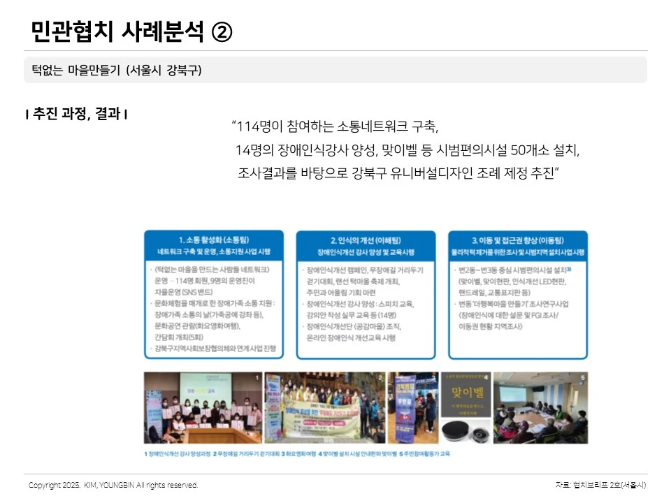 이런 인식개선 활동과 현황보고서 등의 내용들을 강북구 의회 측에 전달하고, 의원들을 만나 소통과 설득을 했고, 그 결과로 강북구 공공디자인 조례를 제정하게 되었다고 합니다. 민관협치사업을 통해 굉장히 의미 있는 성과를 마련한 사례라고 볼 수 있습니다.