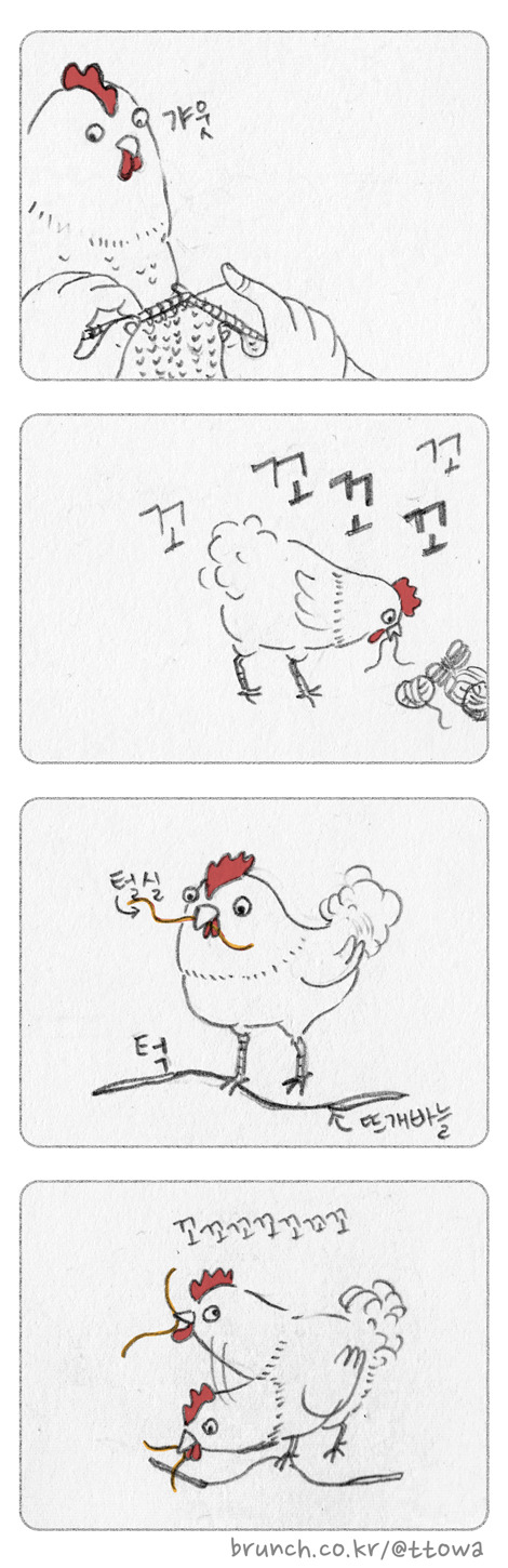 그리고 굴러다니는 뜨개바늘을 발견하고서는 한쪽발로 뜨개바늘을 밟고 부리로 실을 바늘에 갖다대며 이렇게 하면 된다는 듯 신나게 꼬꼬거렸다.