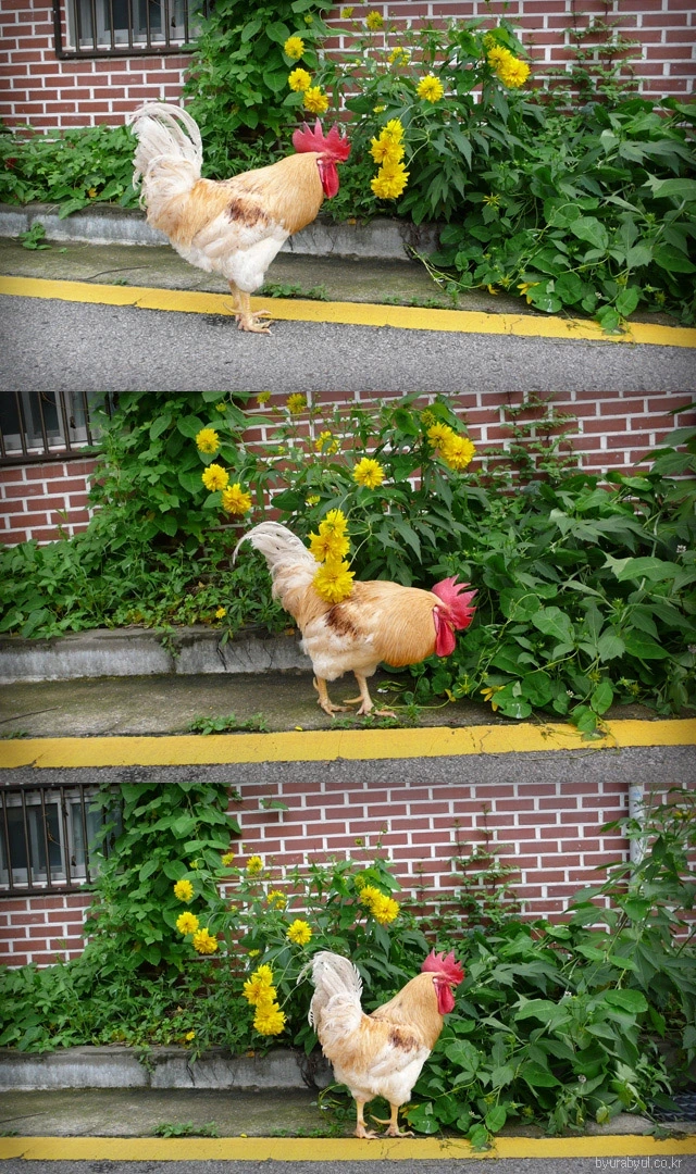 노랗고 빨간색을 가진 이쁜이는 꽃들과 참 잘 어울렸다. 꽃을 배경으로 이쁜이 사진을 찍으면 자기가 예쁜 걸 아는지 이리저리 포즈를 취하곤 했다. 사진을 찍다가 지루해지면 힘차게 꼬끼오를 외쳐 구경꾼을 모으기도 했다.