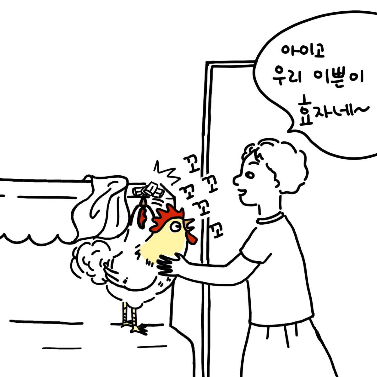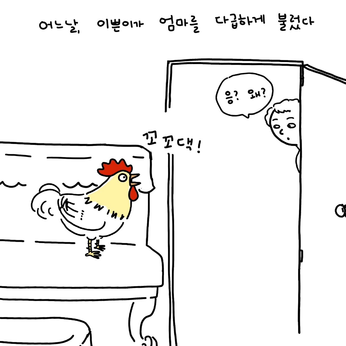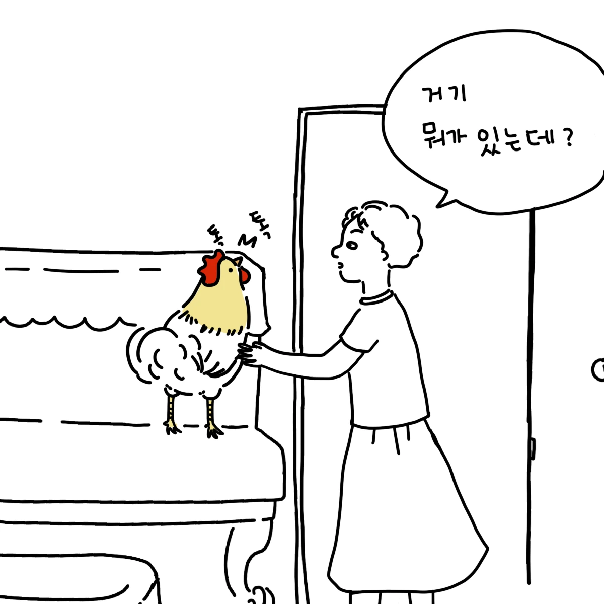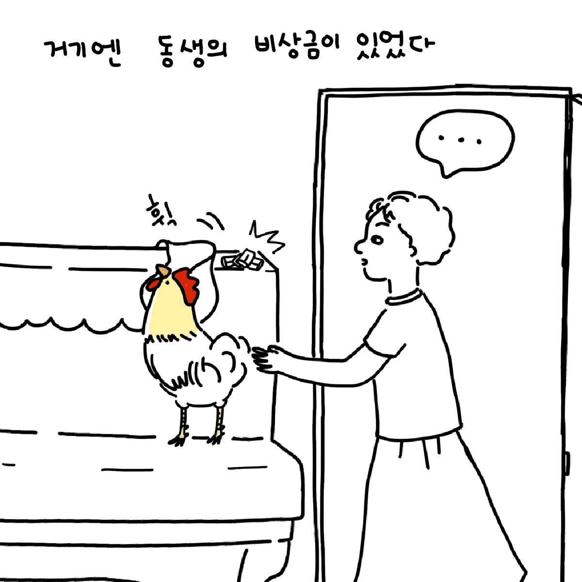 이쁜이는 피아노 위 한 귀퉁이를 부리로 콕콕 찌르며 꼬꼬꼬 여기 뭐가 있다고 알려주었다. 엄마가 뭐냐고 묻자 피아노 커버를 들어 올리며 꼬꼬꼬 거리는데, 그곳엔 동생이 차곡차곡 모은 비상금이 있었다.