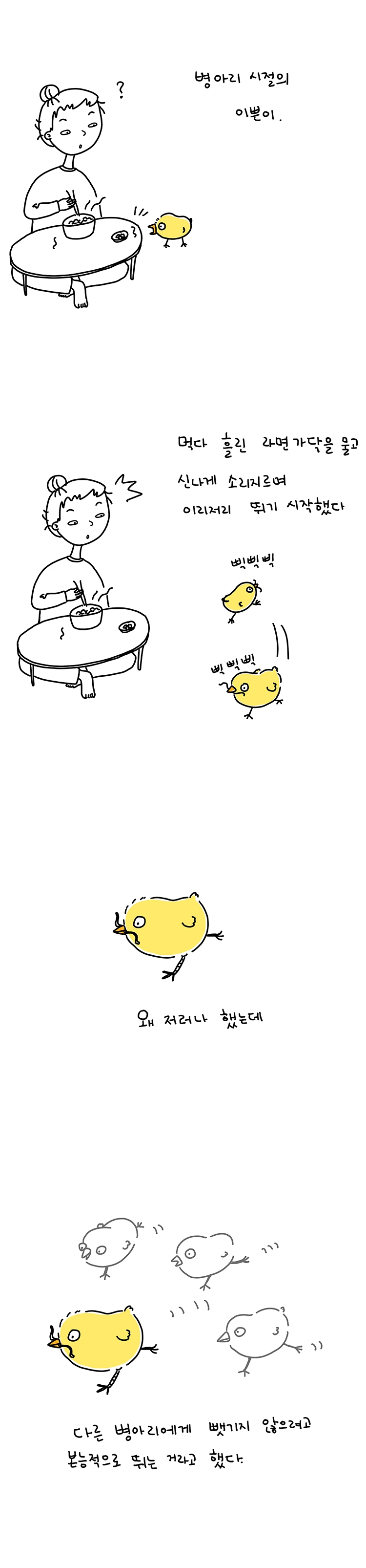 이쁜이가 아직 계란보다 조금 더 큰 병아리 시절, 라면을 끓여 상에 놓고 먹고 있는데 이쁜이가 다가왔다. 이쁜이는 상 끄트머리에 흘린 짧은 라면 가닥을 유심히 보다가 순식간에 라면 가닥을 물고 뛰기 시작했다. 삐약삐약 힘차게 외치면서 사방을 뛰는 모습이 귀여워 다 같이 웃음을 터트렸다.