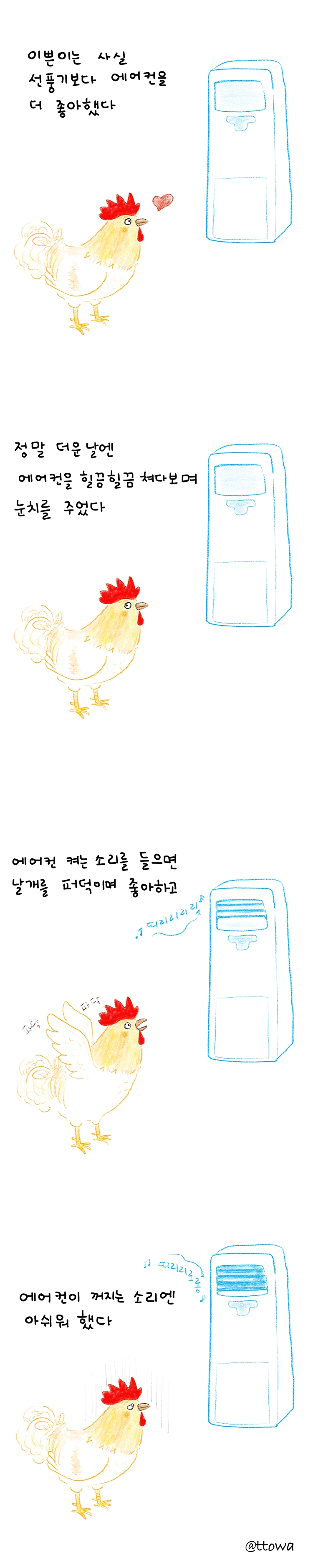 우리 집은 실내온도가 30도가 되어야 에어컨을 켰는데, 에어컨이 켜질 때 나오는 띠리링 소리를 들으면 무척 기분 좋게 날개를 파닥거렸다.