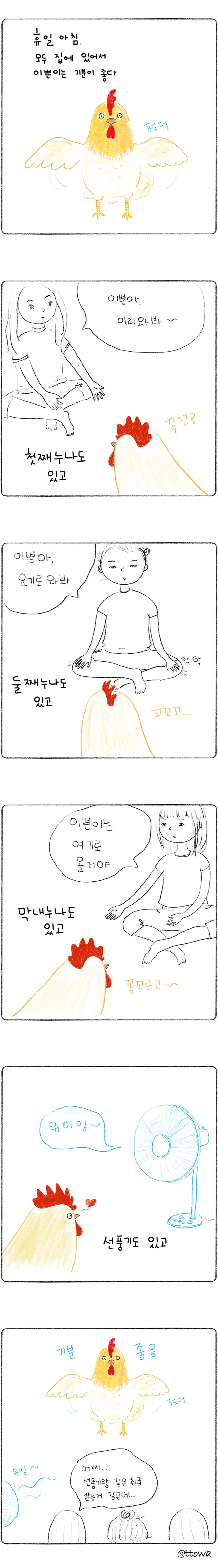 한 사람씩 얼굴을 들여다보던 이쁜이. 언니, 나, 동생, 그리고 선풍기에 차례로 눈길을 주더니 기분이 좋아 마구 활개를 치더니 꼬끼오를 외쳤다.