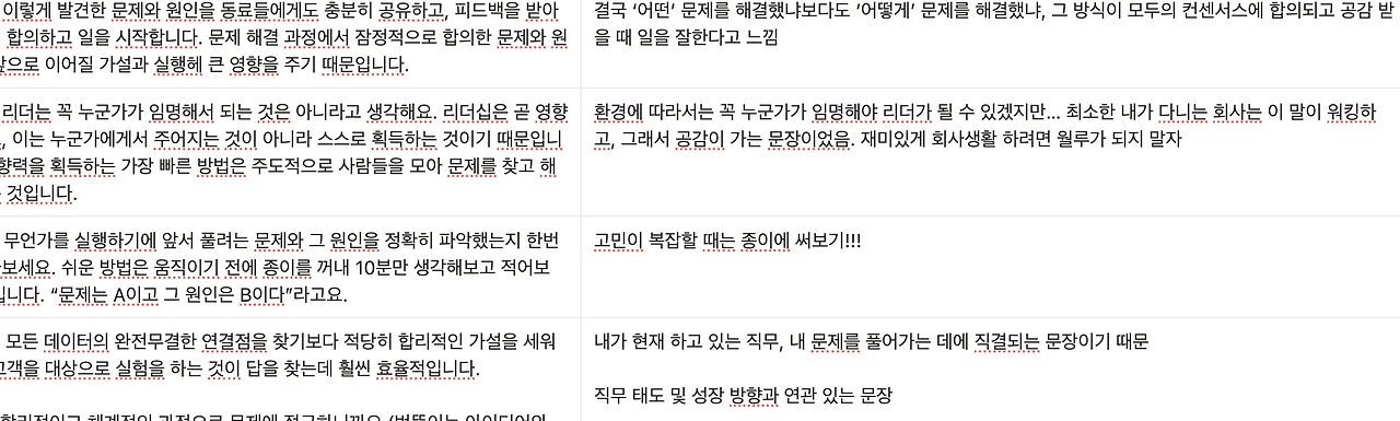 문제를 해결하는 과정에서 모두의 합의를 이끌어내고, 컨센서스를 맞추는 시간을 보냈던 사람들이 떠오르면서 일을 상식적이고 합리적으로 하는 사람들이 곧 잘하는 사람들로 느껴졌다는 생각이 들었다.