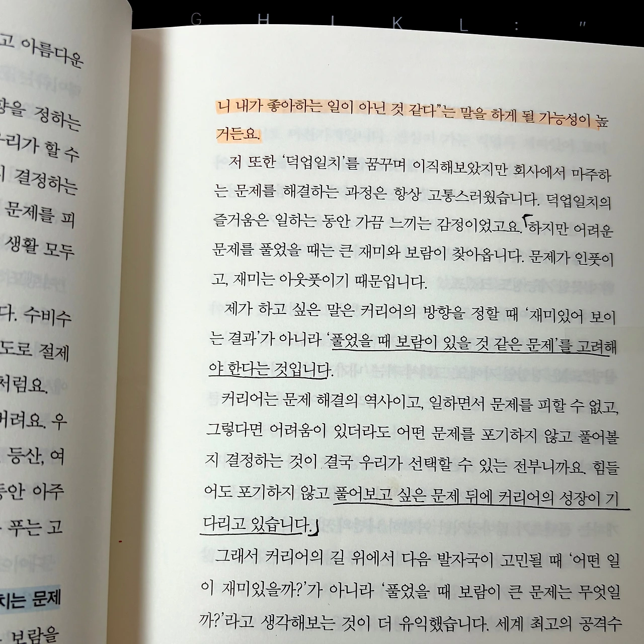 커리어의 여정에서 재미만 기대한다면 결국 어려운 문제를 풀지 못하고 포기하면서 ‘지금 하는 일은 막상 해보니 내가 좋아하는 일이 아닌 것 같다’는 말을 하게 될 가능성이 높거든요.