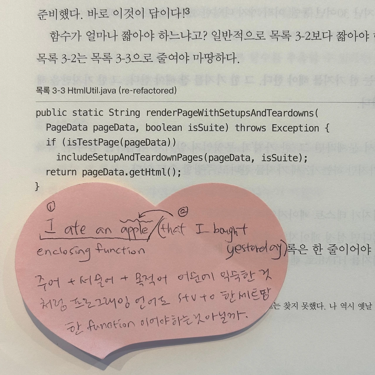 마치 영어의 어순처럼 함수도 구구절절 읽지 않아도 바로 결론을 알 수 있도록 작성해야 하는 게 아닐까? 목적어가 주절주절 길어질 것 같으면 별도의 함수로 분리해서 각 함수에는 (주어 + 서술어) 세트로 무엇이 무엇을 하는지 결론이 한눈에 보이도록 하면 가독성이 좋은 코드로 느껴지는 게 아닐까 싶다.