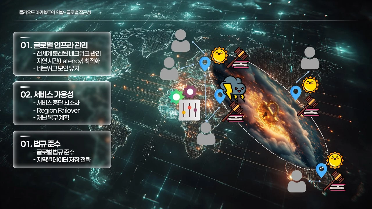 이를 위해 클라우드 아키텍트는 글로벌 인프라와 서비스 가용성을 관리하며, 다음과 같은 요소를 고려합니다.