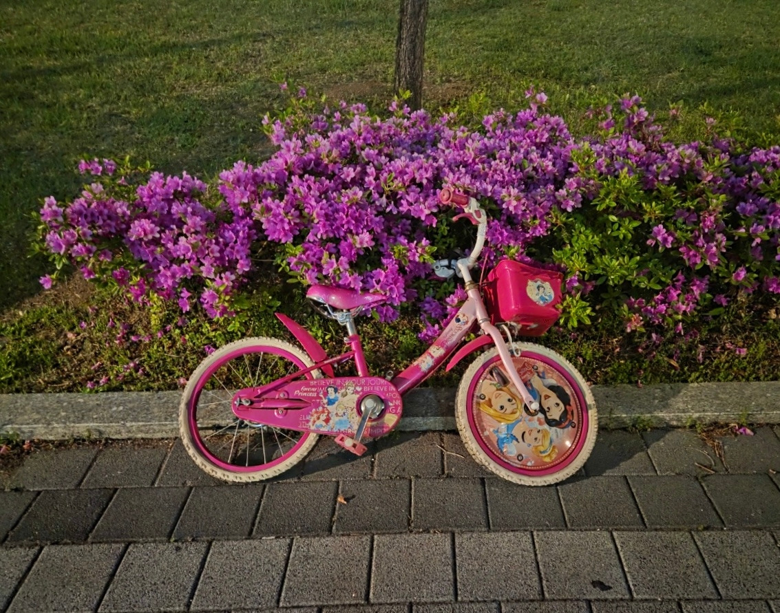 철쭉이 만개한 길가에, 철쭉과 꼭 닮은 핑크빛 옷을 입은 자전거 한 대가 옆으로 살짝 누워 있었다.