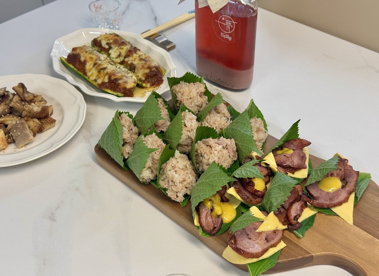 참치마요쌈, 훈제오리쌈, 애호박치즈구이, 버섯구이.