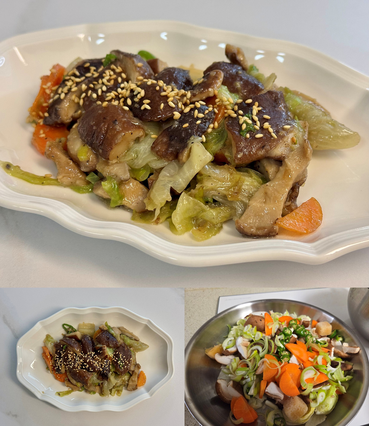 냉장고 속에 남아있던 야채들과 표고버섯을 기름 두르고 휘리릭 볶는다.