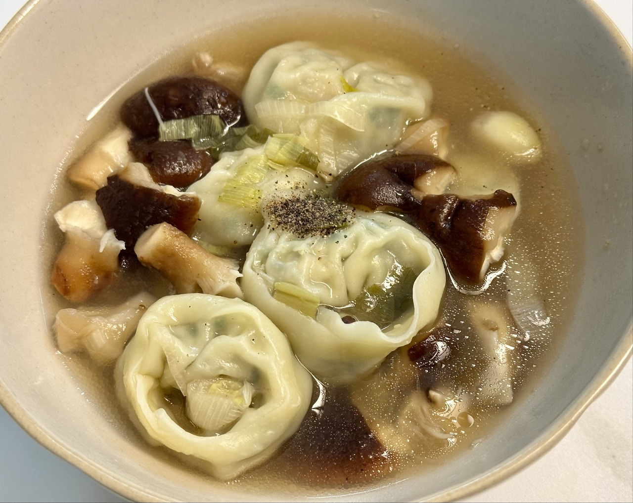 바쿠테의 남은 국물은 다음 날, 냉장고 속 버섯과 만두를 넣고 다시 끓였다.
