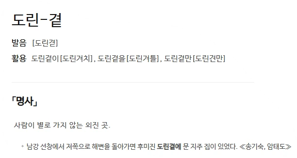도린결로 오용되기도 하는 "도린곁"은 사람들이 별로 가지 않는 외진 곳을 일컫는 순우리말이다.