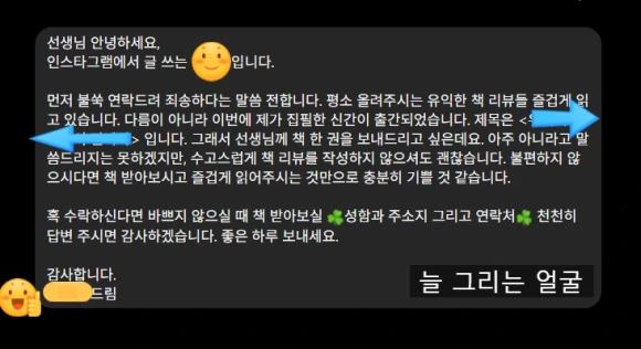 출판사나 서평단 대표님, 독서모임 멤버들에게 받는 메시지가 아니라 작가님께서 직접 보내주신 메시지였다. 인스타에 올린 서평 글을 즐겨보고 계신다고 이번에 새 책이 나왔는데 읽어보지 않겠냐고 권해주셨다.