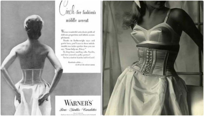스타킹이 점령하면서 완전히 사라질 줄 알았던 코르셋은 2차 대전 후 매력 어필 용으로 섹시한 여배우들이 볼륨 있는 몸매를 강조하면서 다시 등장할 기미가 보입니다. 드디어 1940년대 후반 디올의 뉴룩, 소위 모래시계 체형이 폭발적 인기를 얻으면서 폭발적으로 부활합니다.