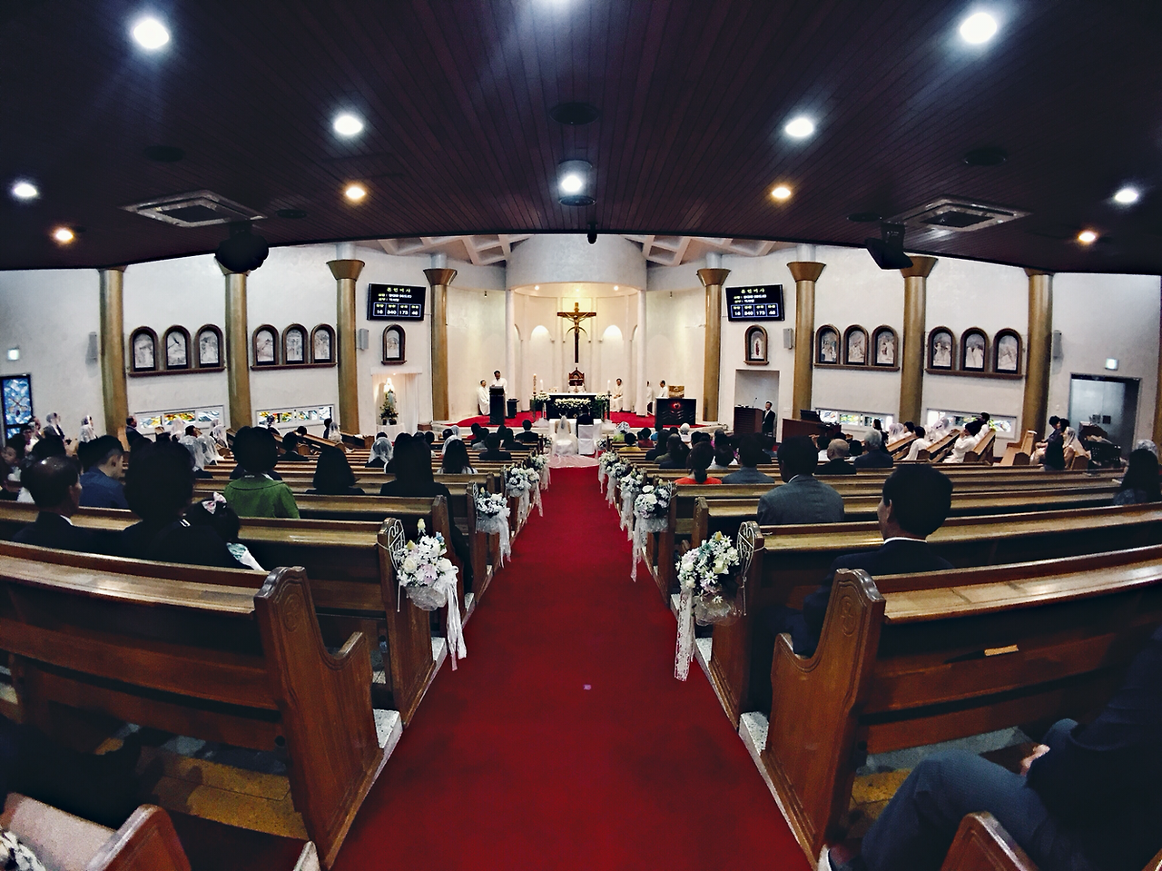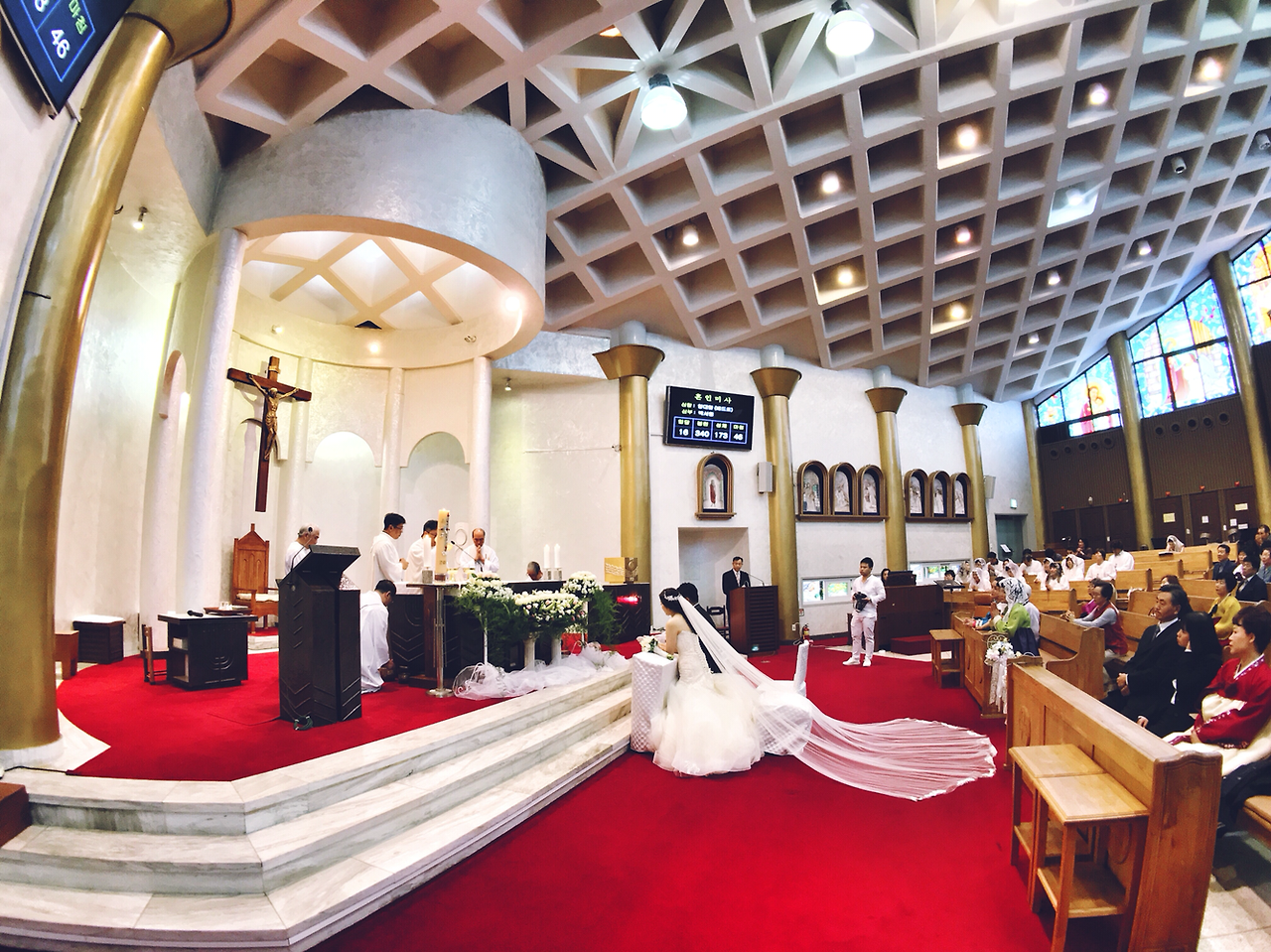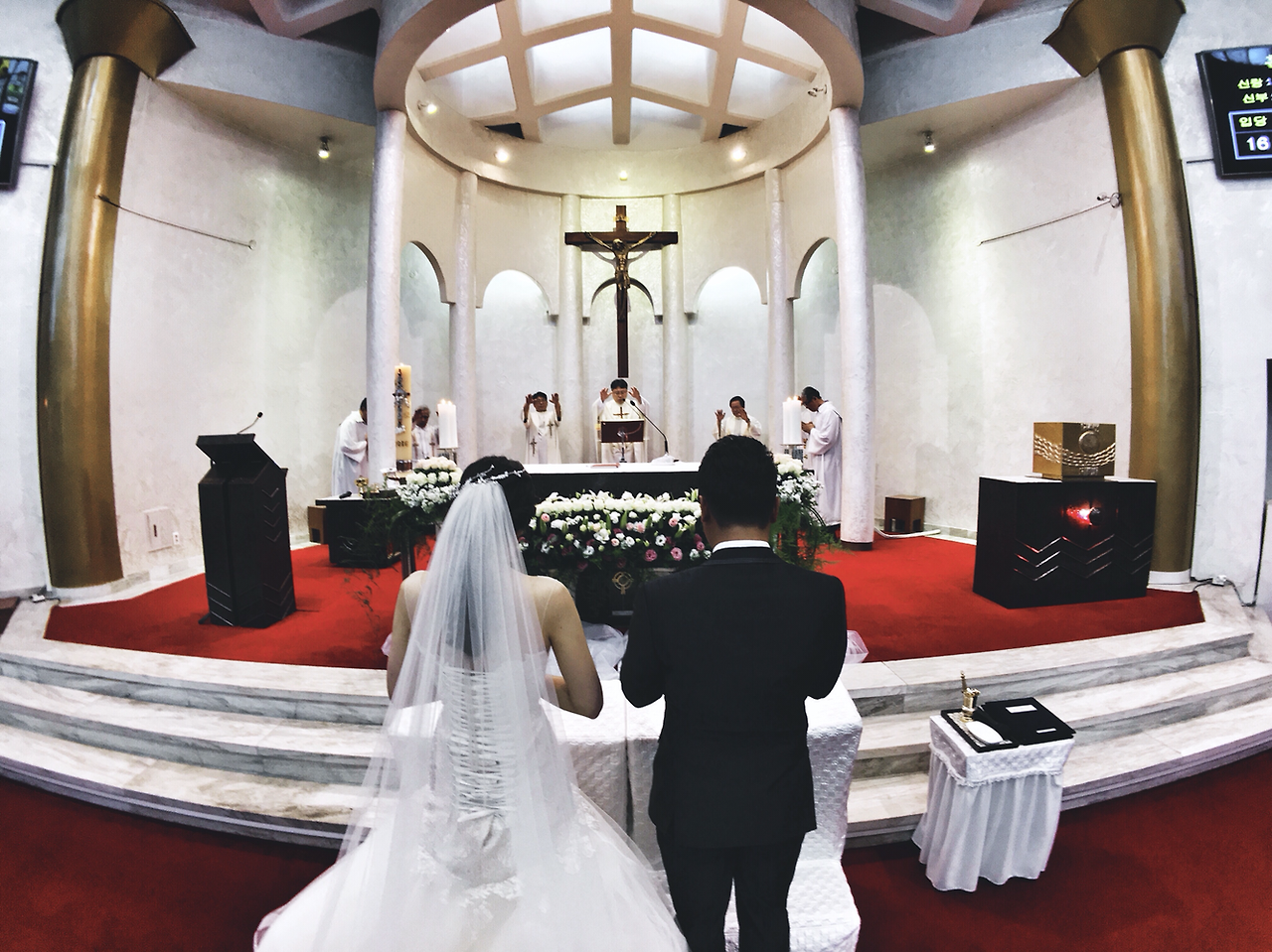 그래서 폰카로 웨딩 스냅사진을 찍어보기로 결심했습니다. 하지만 아직은 많은 분들의 인식이 결혼식을, 게다가 성당 안에서 이루어지는 예식에 스마트폰만 들고 다니면서 사진을 찍는 모습이 조금은 안 좋아 보일 것 같아 부득이하게(?) 한 손에는 DSLR을 들고 셔터 소리를 내며 사진을 찍는 흉내만 내고 모든 사진들은 폰카로만 찍었습니다. 촬영은 스마트폰 전용 렌즈인 캠온 슈퍼와이드 렌즈를 사용했습니다.