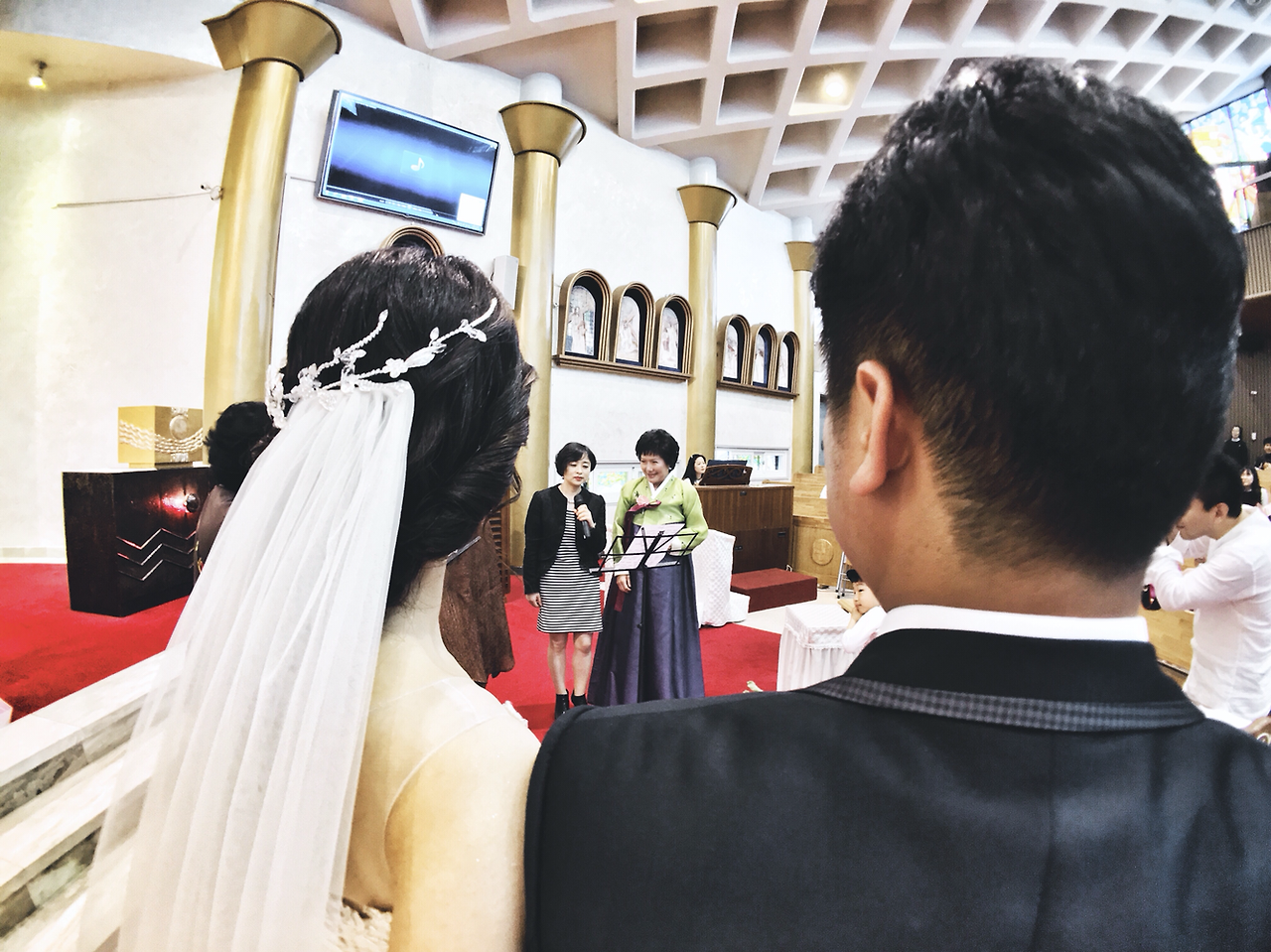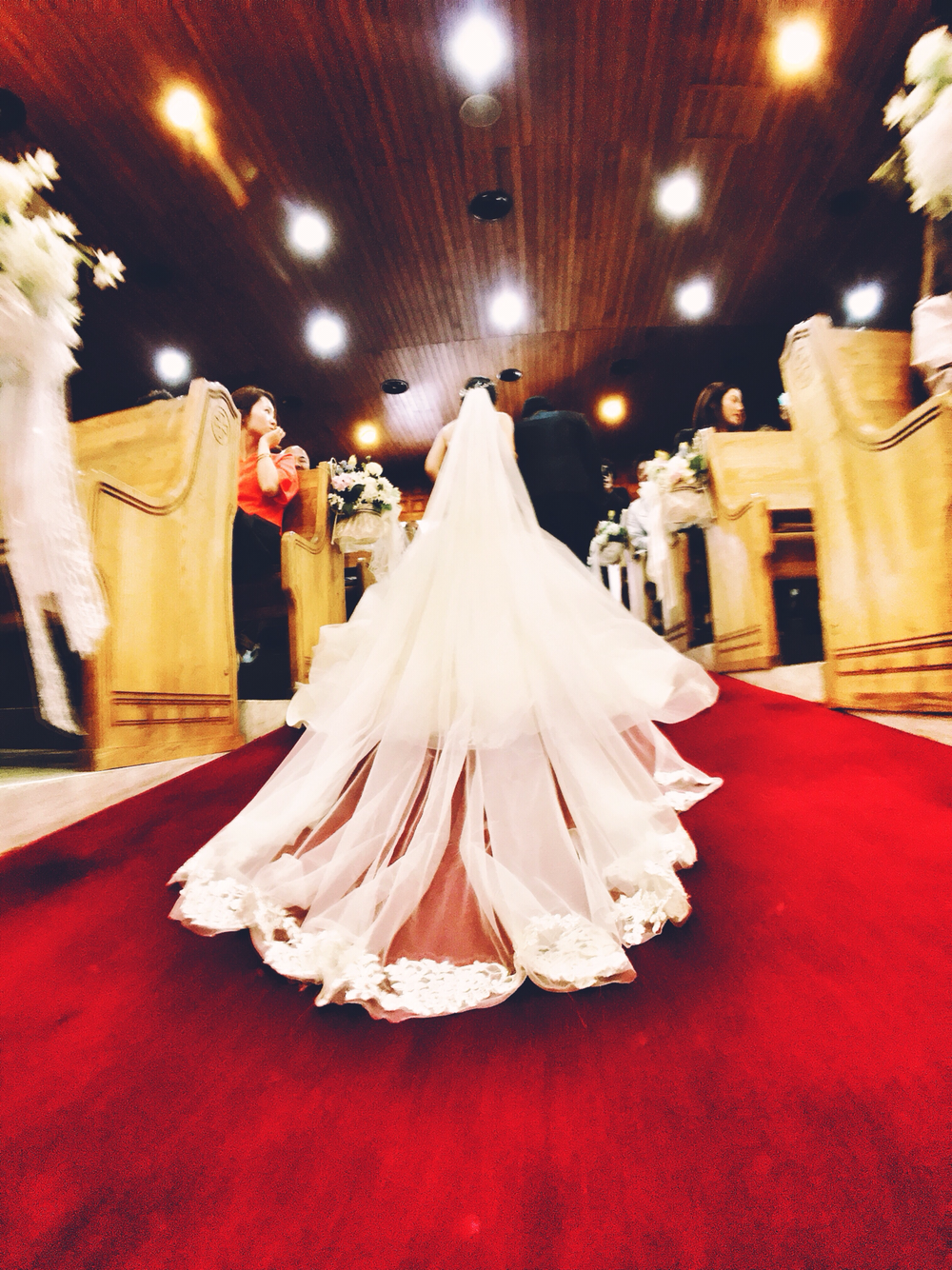 이 사진은 제가 가장 맘에 드는 컷입니다. 신랑 신부가 퇴장하는 모습을 최대한 바닥에 렌즈를 대고 뒤에서 촬영한 모습이네요. 새하얀 웨딩드레스와 레드카펫, 새로운 출발을 축하하는 순간인만큼 조금은 특별하게 담고 싶었습니다. 만약에 DSLR이었으면 바닥에 엎드려 사진을 찍어야 했지만 폰카이었기에 폰을 거꾸로 해서 팔을 뻗어 아래로 내리고 쉽게 촬영을 할 수 있었습니다.
