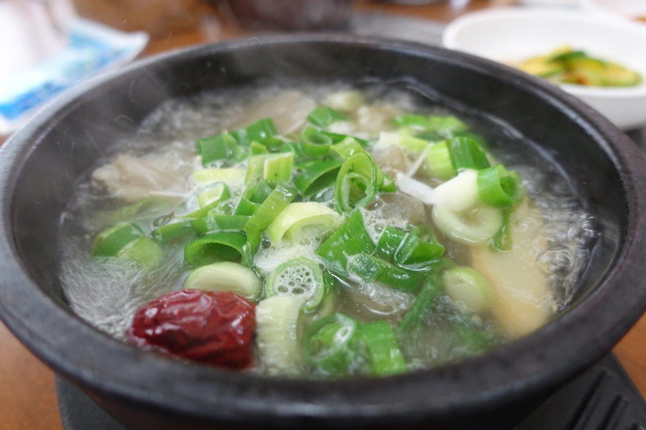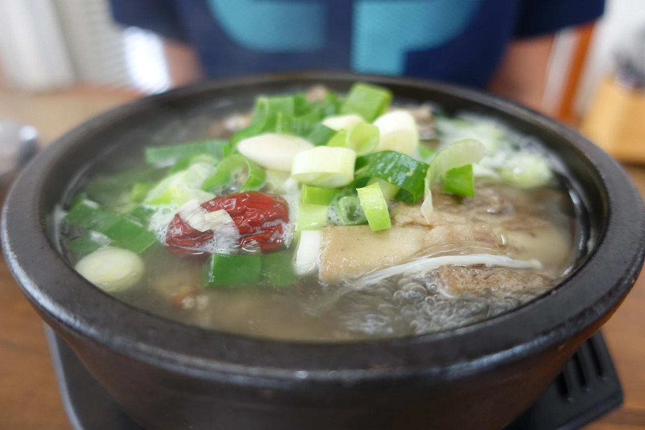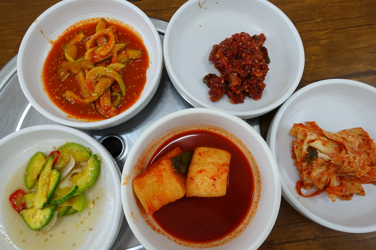 무얼 먹을까 고민하다가 한방갈비탕 하나, 도가니탕 하나를 주문했어! 반찬부터 나왔는데... 깍두기에 실망! 무로 만든 큰 깍두기를 정말 좋아하는데... 한 사람에 하나씩밖에 안 주다니!! 아무튼 음식이 나오면 먹다가 더 달라고 해야겠다고 생각했어.