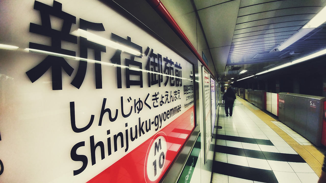 숙소에서 여행지로, 다시 숙소로 돌아오기 위해서 꼭 들러야 하는 도쿄 지하철 신주쿠교엔마에 역입니다. 신주쿠 일대의 가장 큰 국립공원 앞에 있어 '신주쿠교엔마에'라고 불리는 역인데, 바로 앞에 있음에도 불구하고 이 공원도 들러보지 못했답니다. 밖으로 왔다가 돌아올 시간엔 꼭 닫혀 있더라고요. 나중에 보니 폐장시간이 무척 일렀던 것으로 기억합니다.