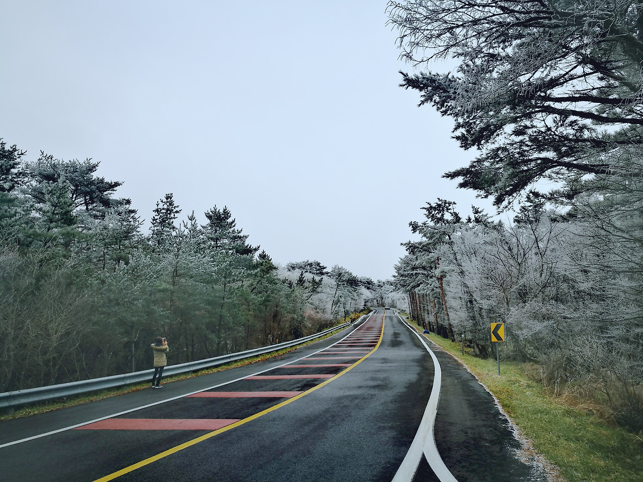 1100도로를 따라가는 길, 한라산에 가까워질수록 주변 오름의 정상에는 눈이 쌓여 있는 모습이 보이고 길 양옆의 나무들에도 하얗게 눈꽃이 피어 있는 모습이 보이기 시작했습니다. 한라산을 오르면 더욱 멋진 제주의 설경을 만날 수 있지만, 시간이 없거나 등반이 어려운 분들은 1100고지에서도 충분히 한라산의 설경을 만끽할 수 있습니다.