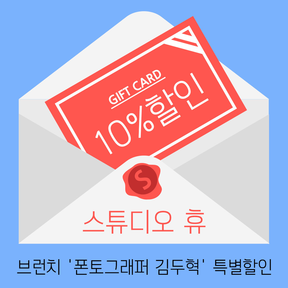 제가 기획팀으로 소속되어 있는 만큼 '폰토그래퍼 김두혁'의 브런치를 통해 '스튜디오 휴'의 정보를 얻고 매장을 직접 찾으시는 분들을 위해 특별한 할인쿠폰을 제공해 드립니다. 아래의 쿠폰을 저장하시거나 캡처 화면을 계산 시 보여주시면 10% 할인된 금액으로 '스튜디오 휴' 상품을 이용하실 수 있답니다.