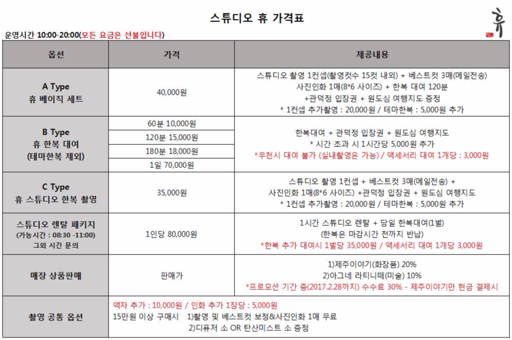 아직은 오픈한 지 얼마 되지 않아 많이 알려져 있지 않은 '스튜디오 휴', 하지만 제주에서 색다르고 재미있는 또 다른 새로운 문화를 만들어 가려는 포엠의 의지가 담겨있는 매장입니다. 우리의 전통의상인 한복을 입고 다양한 컨셉을 연출하고 나만의 추억을 담을 수 있는 '스튜디오 휴'!