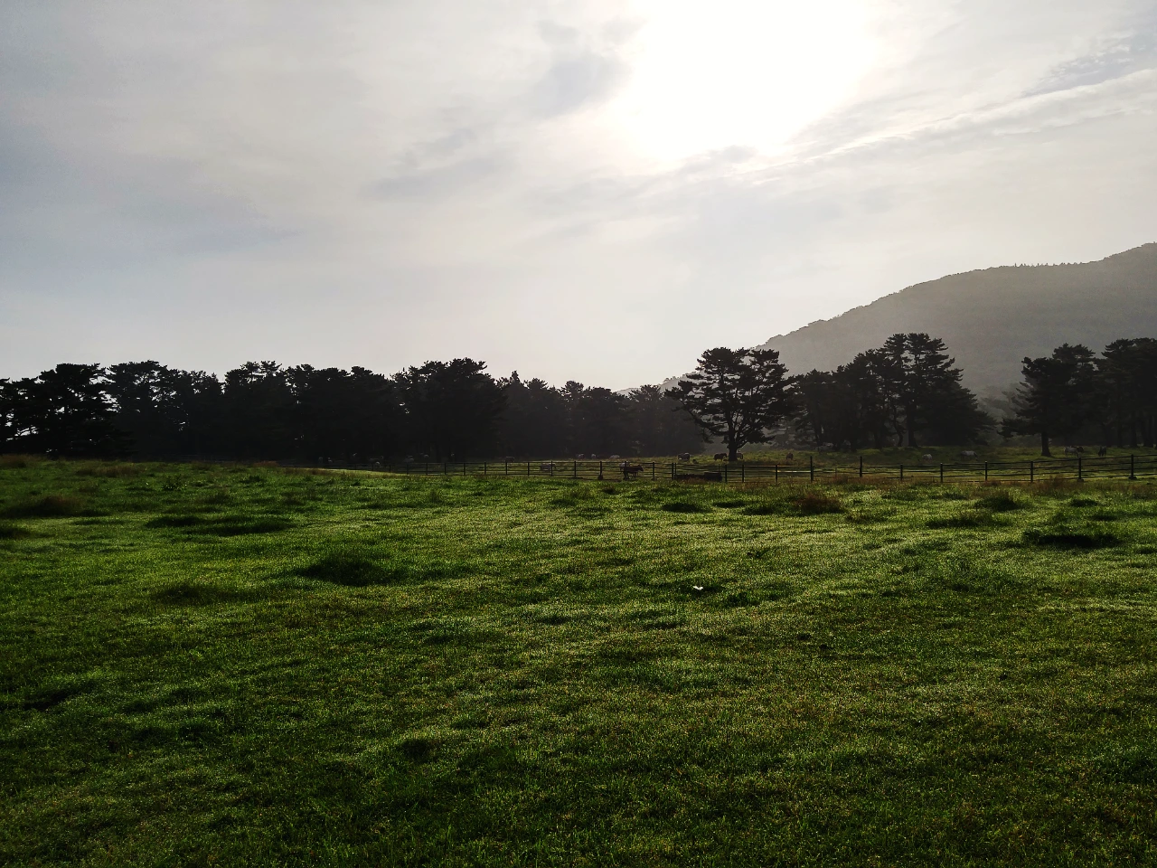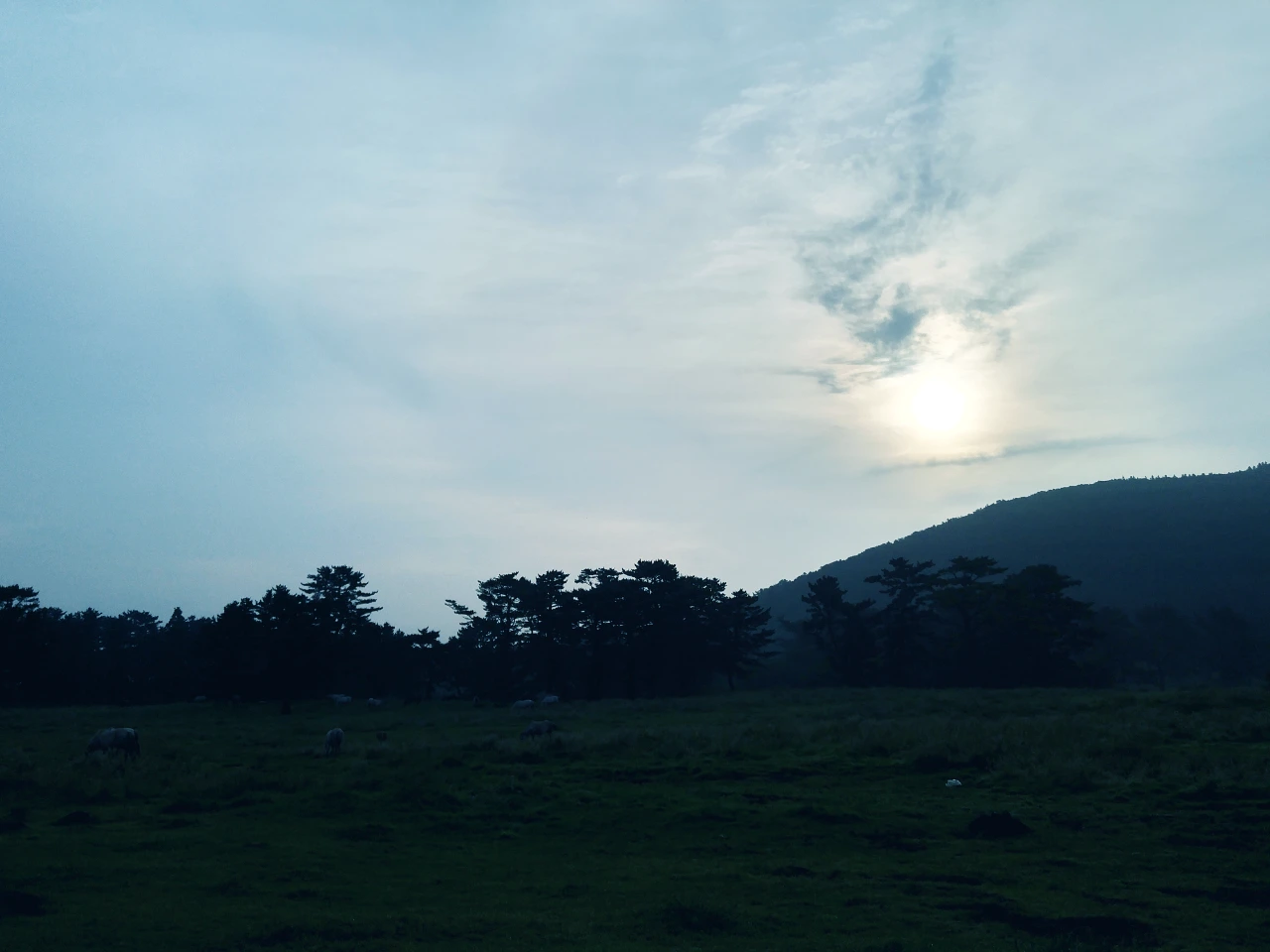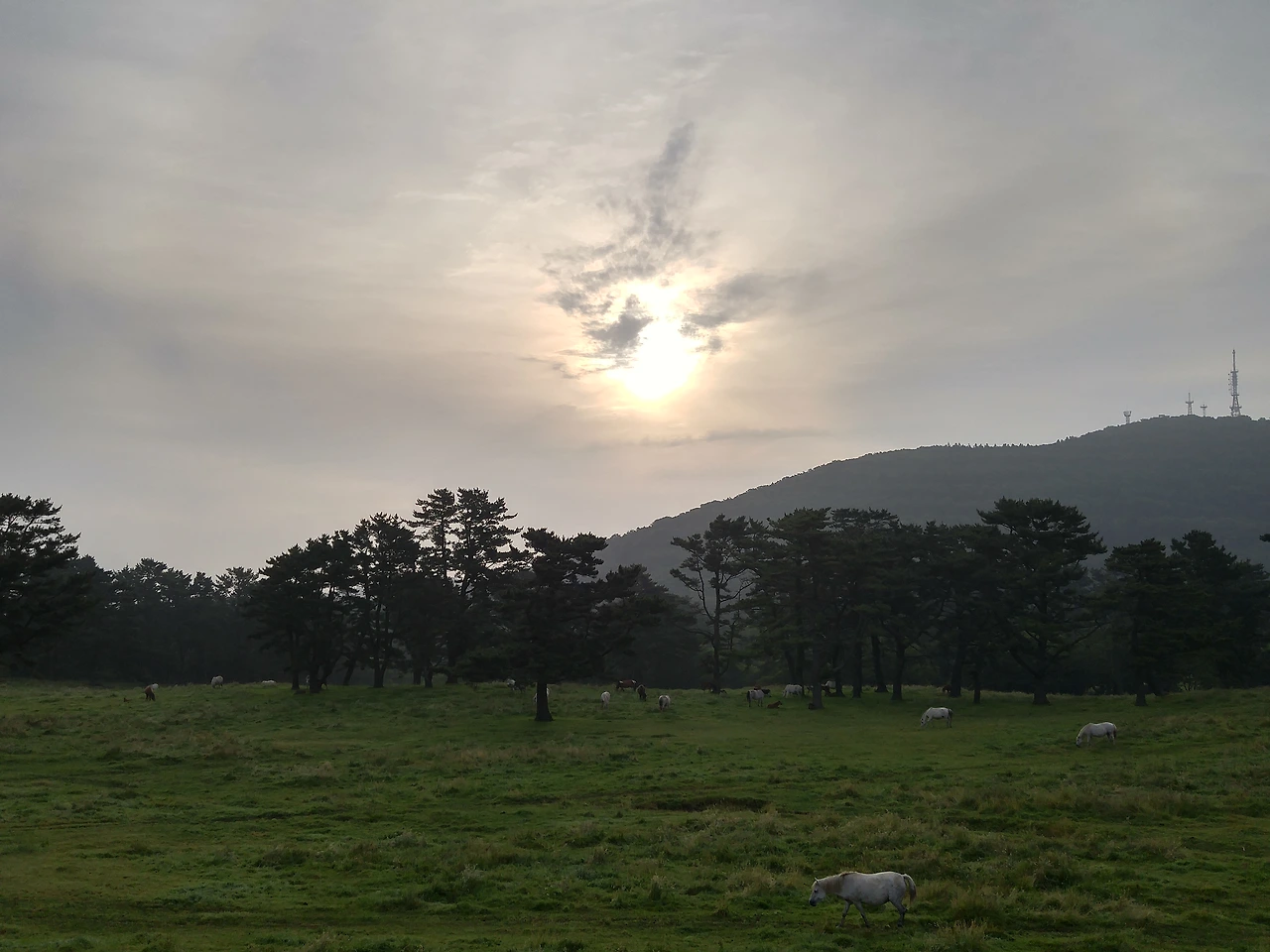 해가 떠 오른지는 조금 시간이 지났지만 이제야 태양이 건너편 오름을 넘어 왔습니다. 제주마방목지의 아침은 이제야 시작이네요!