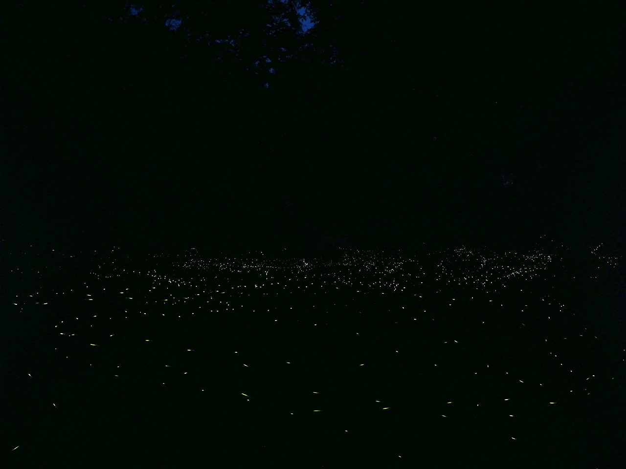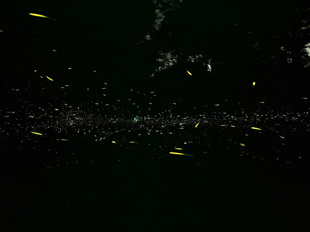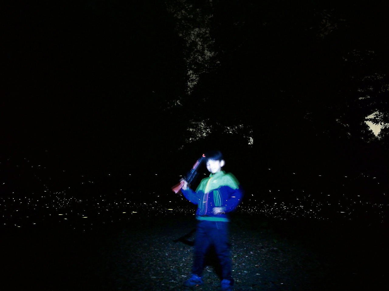 반딧불이를 찍기 위해 가족이 함께 길을 나섰습니다. 태어나서 처음으로 실제 반딧불이를 본 아홉 살 아들이 반딧불이와 함께 사진을 찍어달라고 하더군요. 처음에 어떻게 찍을까 고민하다 사진을 찍는 중간에 카메라 앞으로 가서 서 있는 순간 조명을 잠깐 비췄다 끄고 계속해서 반딧불이를 찍으니 아래와 같은 사진이 나왔습니다.