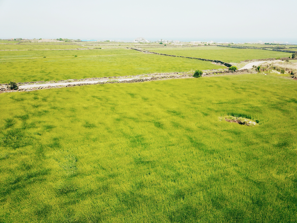드론을 띄워 하늘에서 바라 본 우도의 청보리밭은 더욱더 아름답습니다. 바람의 방향에 따라 고개를 흔드는 청보리의 물결은 지상에서 볼 때와는 또 다른 느낌으로 다가옵니다.