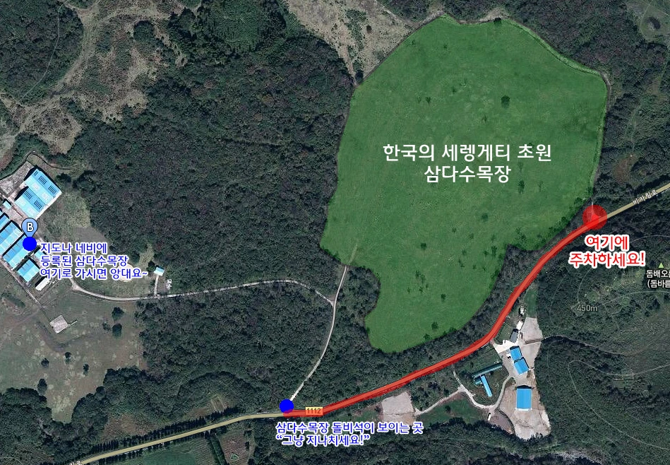 사려니 숲길에서 산굼부리 방향으로 1112번 국도를 따라가면 왼쪽에 삼다수목장이라고 쓰여 있는 비석이 보입니다. 아마 내비게이션은 좌회전해서 들어가라고 할 텐데 절대 들어가시면 안되고 그냥 지나쳐서 쭈~욱 가주세요! 사진의 빨간 길을 따라 앞으로 직진~~