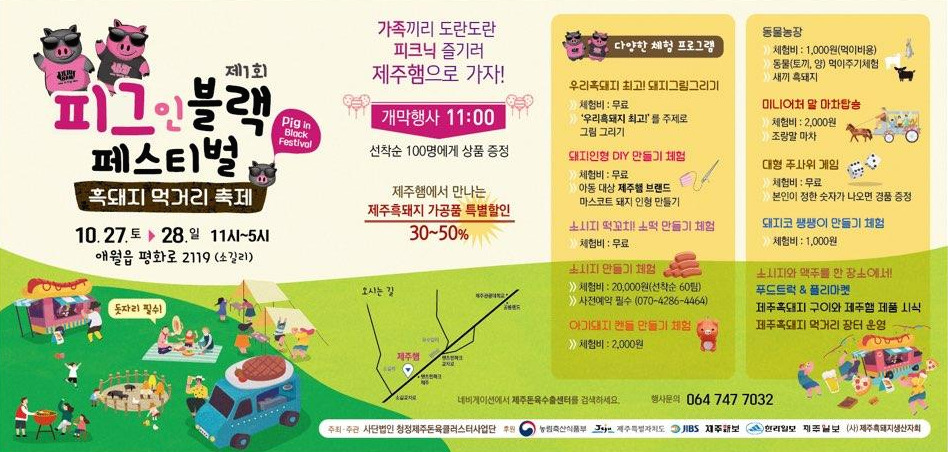 제1회 피그인블랙페스티벌은 제주 흑돼지로 만든 다양한 제품을 만날 수 있는 기회입니다. 오는 10월 27일(토)부터 2일간 열리는 흑돼지 먹거리 축제를 소개합니다.