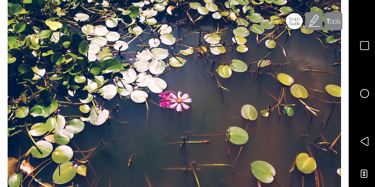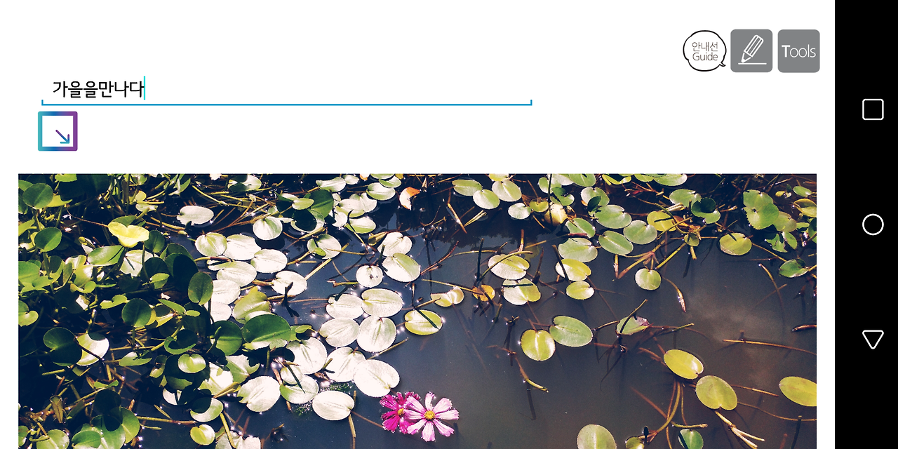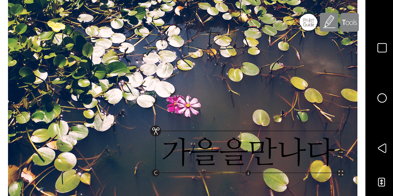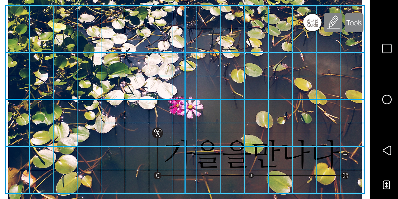 갤러리에서 사진을 불러오면 사진의 방향에 따라 가로/세로 모드로 바뀝니다. (큰 화면에서 편집을 쉽게 할 수 있도록 사진에 따라 가로/세로 모드를 고정한 것 같은데 단순히 텍스트만 넣을 땐 세로 고정 모드도 지원했으면 좋겠습니다) 그리고 원하는 글자를 넣으면 비율과 크기를 자유롭게 조절할 수 있습니다. 세밀한 편집을 위해서 안내선도 표시할 수 있어요~